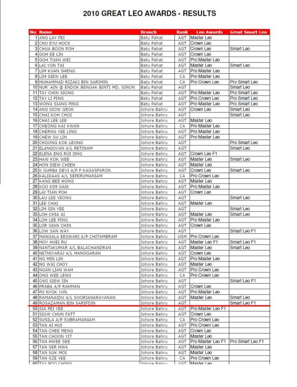 Pencapaian Keempat layak untuk menerima penganugerahan Great Smart Leo Award di Genting. Syarat kelayakan ANP RM50,000