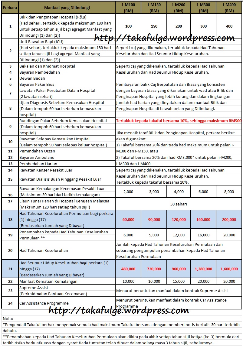 6- kemalangan (conprenensif) manfaat ini akan meningkat sebangak 5% setahun secara percuma sehingga 10 tahun. bermaksud (daripada contoh) pada tahun ke2 manfaat kemalangan RM21,000 dah tahun ke 10 manfaat ini RM30,000. selain daripada itu anda juka boleh claim untuk pesakit luar RM25/1000 ( dari contoh RM25/20,000)=RM500 selain tu manfaat MC juga anda akan peroleh RM150 (MC seminggu)