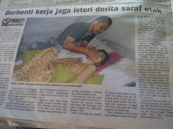 “Bukan hanya mendapatkan rawatan di hospital saja, malah saya juga sudah berikhtiar menggunakan kaedah rawatan Islam yang diperkenalkan beberapa kenalan, namun keadaan isteri masih tidak berubah dan bertambah teruk sejak 10 bulan lalu,” katanya. Sebarang bantuan boleh disalurkan dengan menghubungi Abil Fikri di 016-2634258 atau memberi sumbangan terus ke akaun bank CIMB milik Abil Fikri Ahmad 0506-0040577-52-1.