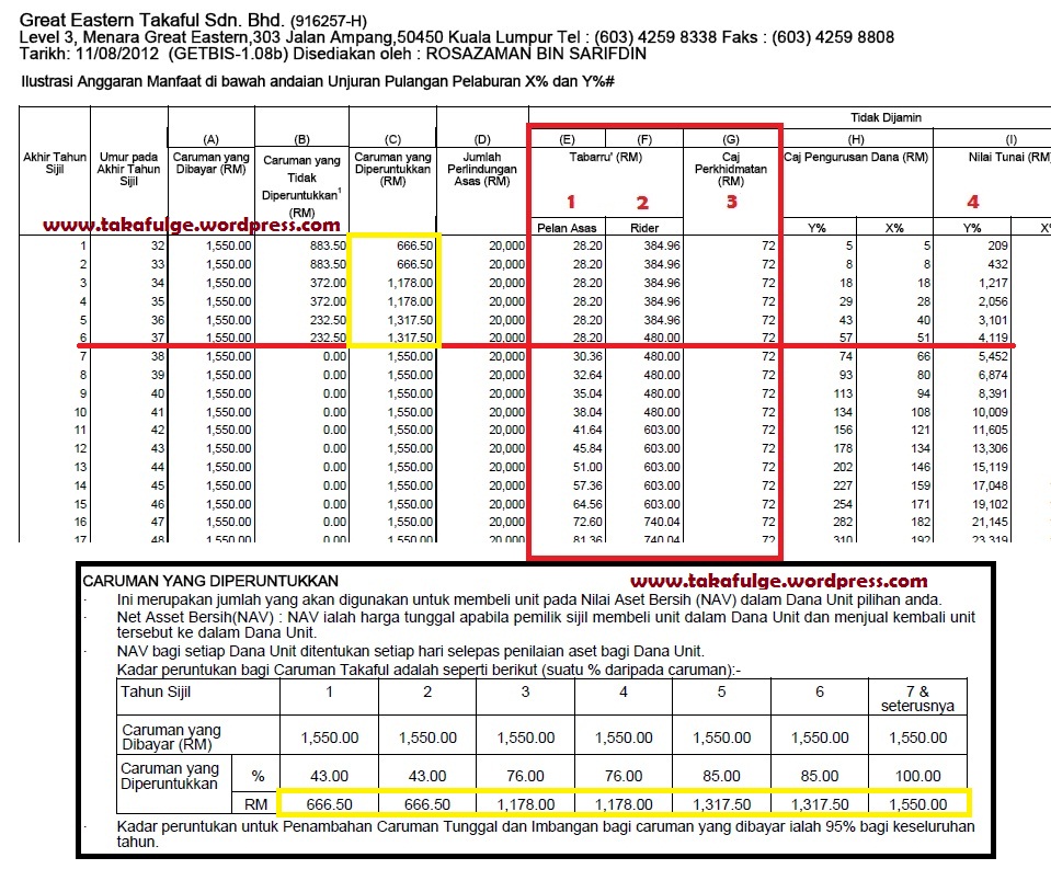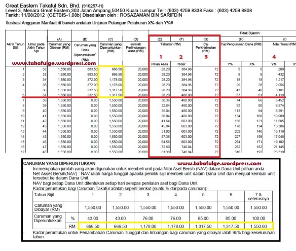 Dalam gambar kedua tersebut jika anda campurkan no 1,2 dan 3 itu adalah jumlah cas perlindungan yang dikenakan. manakala bakinya akan pergi kepada simpanan. Jika kita memilik untuk melebihkan simpanan maka kita bolehlah mengurangkan manfaat perlindungan (rider).