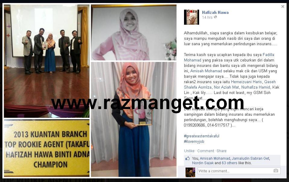 hawaBeliau anak keliharan pahang, Kerjaya bermula dengan paksaan.. hihihi. Walaupun dalam kesibukan belajar beliau mampu untuk mengubah nasib diri dan orang di sekeliling beliau yang memerlukan perlindungan insuran/takaful. Beliau juga merupakan Champion 2013 untuk ketogeri Rookie Agent (takaful) Kuantan Branch.