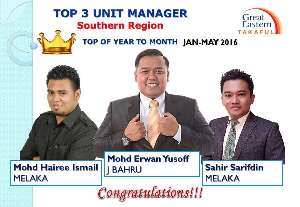 Tahniah dan syabas AM Haji Sahir dan kumpulan kerana berada di kelompok terbaik Great Eastern Takaful Berhad untuk southern region