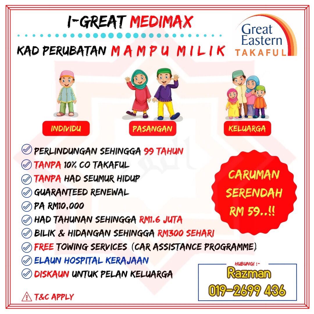 Dengan keadaan ekonomi yang tidak menentu sekarang ini, ramai yang tercari cari plan medical card mampu milik untuk satu keluarga. Alhamdulillah Great Eastern Takaful Berhad memahami permasalahan ini. Oleh itu plan Medical Card/kad perubatan ini di keluarkan kepada anda. I Great Medi Max.