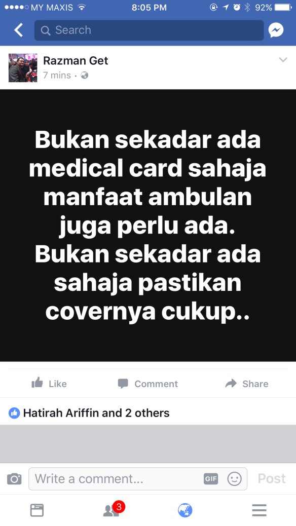 Saya sendiri sebagai agen turun mengambil manfaat ini dan jumlah coverage yang saya ambil sebanyak RM300,000. (Dua sijil RM100,000 dan RM200,000) ini kerana memandang kepada risiko yang saya sering memandu/menunggang motosikal. Bukan ambil untukminta kena tapi sebagai langkah persediaan..