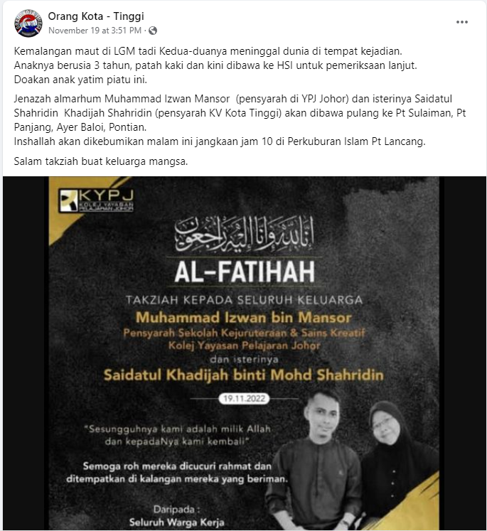 Jenazah almarhum Muhammad Izwan Mansor (pensyarah di YPJ Johor) dan isterinya Saidatul Shahridin Khadijah Shahridin (pensyarah KV Kota Tinggi) akan dibawa pulang ke Pt Sulaiman, Pt Panjang, Ayer Baloi, Pontian.