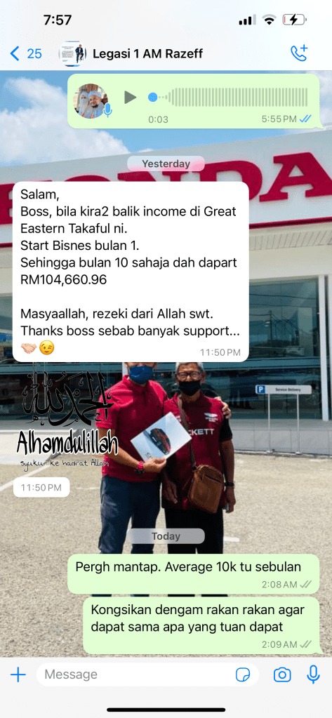 Bukan itu sahaja, beliau juga telah lepas syarat tahun pertama untuk ke Group Manager, yang mana rank tertinggi di Great Eastern Takaful..