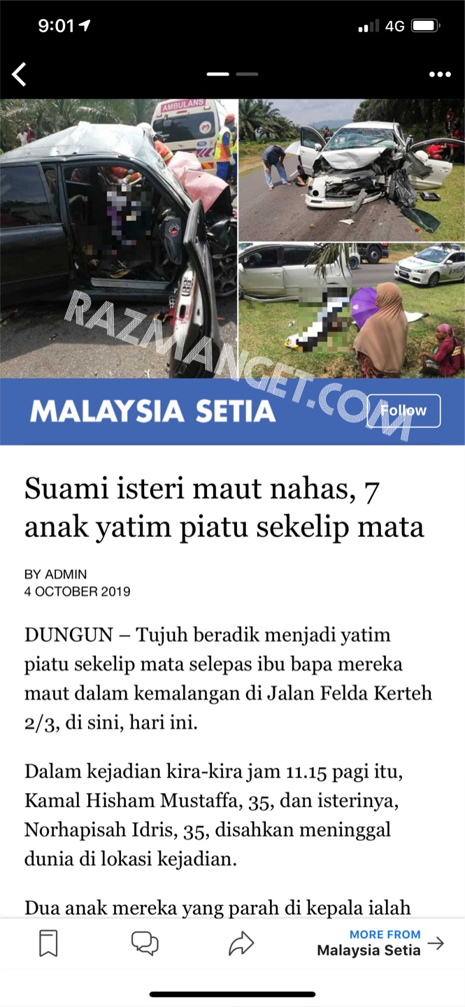 Hari ini lagi berita kematian ibu dan bapa. Kali ini di Dungun, Terengganu. Pada kes ini 7 anak anaknya yatim piatu sekelip mata.