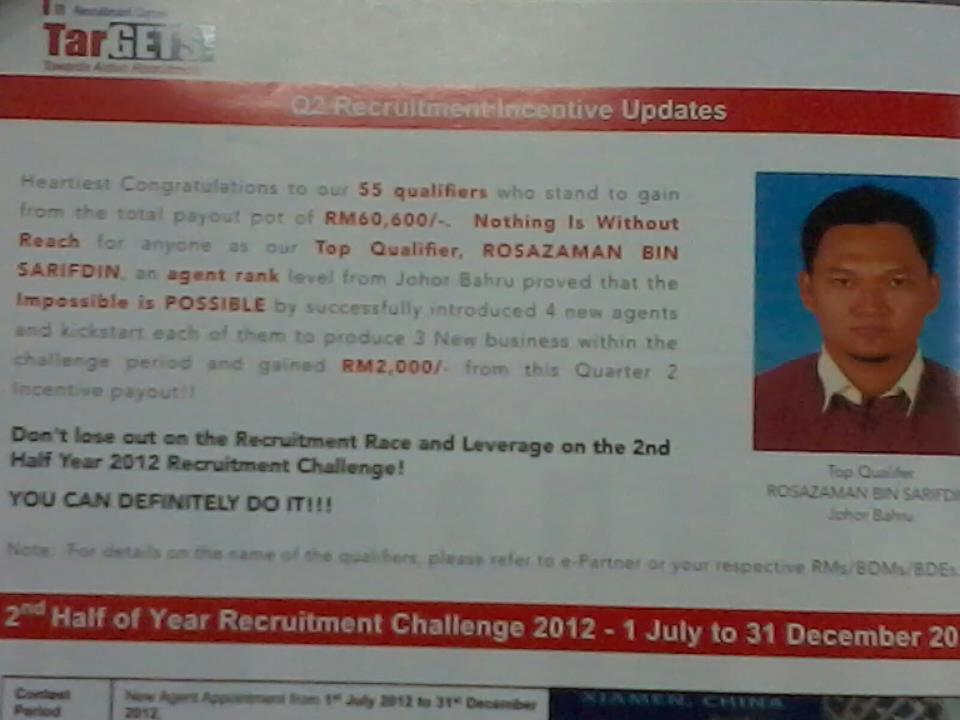 top qualifierSungguh tidak di sangka-sangka saya merupakan Top Qualifier Recuiter untuk Quater 2 pada tahun 2012. TQ Allah. dan lebih bersyukur semua agent tersebut merupakan QIA (Quality Intriducer Agent)  yang membuat minimum kutipan sumbangan takaful RM12,000).